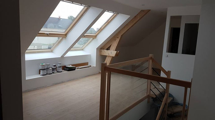 • Toiture : Charpente traditionnelle sur habitation et charpente industrielle sur garage + couverture tuile plate mécanique ardoise, et vélux